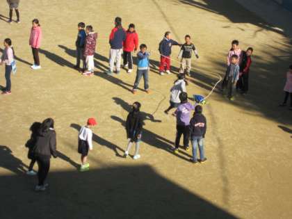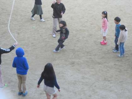 今日も「にこにこタイム」は、グループで大なわ遊びをしました。だんだん跳べる子が増えてきましたが、まだなかなか入れない子もいます。そんな中で、6年生が掛け声をかけたり、抱っこしながら一緒に跳んだりする姿も見られ、みんながにこにこ笑顔の縄跳びになりました。