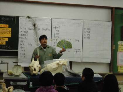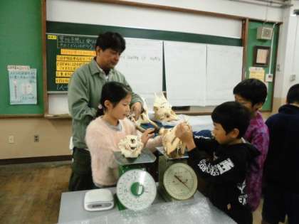 グループに配ってもらって、いよいよ手に取って見当をつけます。重さをはかるのですが、さわり心地を味わったり、なかには、においをかいでいる子もいました。
