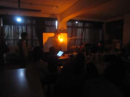 次に,白熱電球と回析格子を使って実験をし,光の3原色について知りました。また,虹のようなものが,「スペクトル」ということを教えていたいただきました。楽しい学習で,時間があっという間に過ぎました。京都大学のみなさんありがとうございました。
