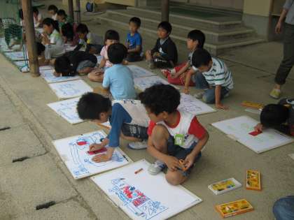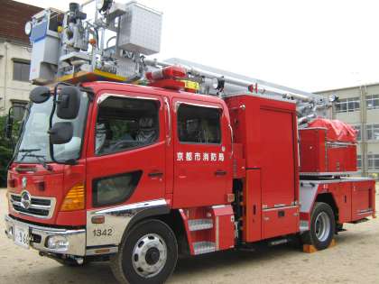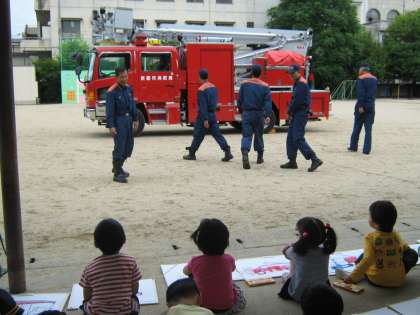 避難訓練で,消防自動車がきたので,3時間目に絵を書きました。よくよく見ると,いろいろな道具や設備がついていました。