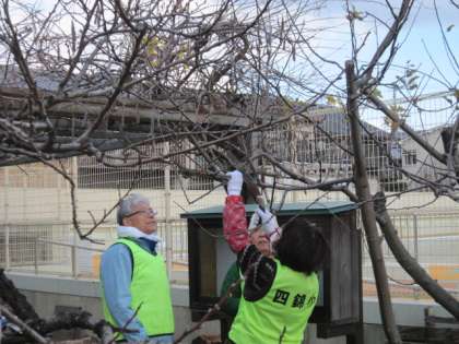 最近は、めっきり寒くなり、ビオトープもすっかり冬の様子になりました。そのような中、ピオトープボランティアの皆さんがりんごやフジの枝の剪定をしてくださいました。はしごに乗って、高い枝までハサミを伸ばして切ってくださいました。このことが、春の花や実につながります。いつも、ありがとうございます。