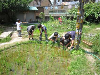 田んぼに水をはっていると水深が浅く,生き物がすぐに発見できます。さかんに覗き込んでいました。オヤマジャクシの小さいのが泳いでいました。子ども達は,カナヘビが前見つけたんだけど〜といいながらみていました。