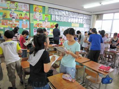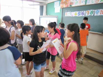 本校では,タスクを意識して,単元構成を考えて授業を進めています。最終的にクイズを創って発表するとか,スペシャルなカレンダーを作るとか,道案内をするとか,1日の生活表を作って紹介するとかです。それに向けて,単語や,質問とその答のやりとりに必要な英語を単元の前半部分で,教えていきます。「リピートアフターミー」ばかりでは面白くないですから,最後のタスク達成のためであることを提示したり,ゲームやチャンツ,歌などで,楽しみなが身に付けていくことをします。また,慣れてきたら,2人組を作って,簡単な英語での言葉のやり取りをします。