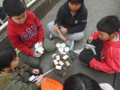授業の最後の振り返りでは,七輪でおもちを焼くことが初めてで楽しかったことや,おもちを焼いていると急にぷーっとふくらんできてびっくりしたこと,昔の人がかまどで火をおこして料理をしていたことが大変だったと感じたという声を交流できて,子ども達はいい体験ができたようです。