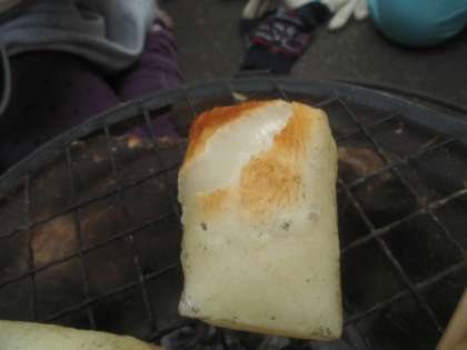 おいしそうなきつね色のおもちが焼けました。