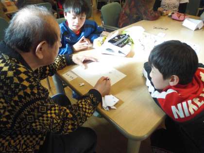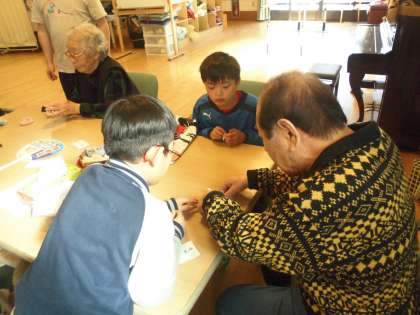 今回は,利用者さんたちと一緒にトランプをしたり,あやとりをしたり,折り紙をしたりしました。子どもたちが「一緒に楽しむためには,何がいいかな」と考え,工夫して内容です。初めは緊張していた様子でしたが,徐々に打ち解けあい,笑顔が出てくるようになってきました。丁寧に言葉をかけている子など,輝いている姿がたくさん見られました。