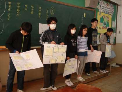 班で意見を整理したことを代表がクラス全体へ伝えました。