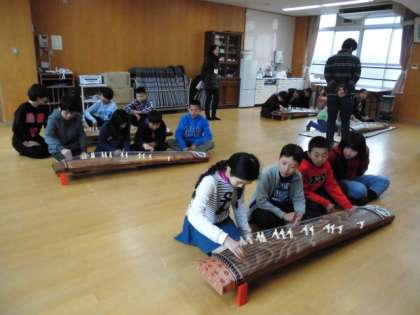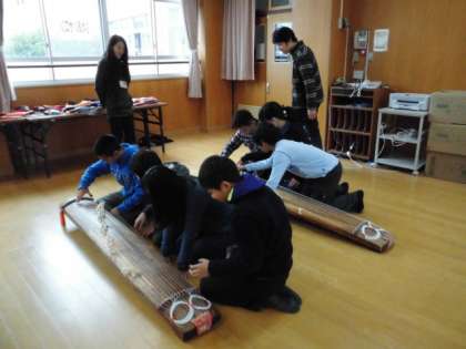 地域の指導者の方にきていただき、箏に実際に触れて、音を出して演奏するところまで教えていただきました。