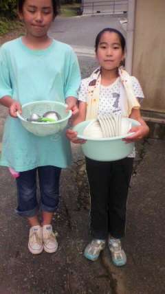 食器や包丁,まな板など使うものを熱湯消毒をしてから使います。道具を持って熱湯の出るところまでいきます。