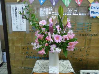 入学式に向けて玄関のお花も、PTAの文化委員会で活けてくださいました。