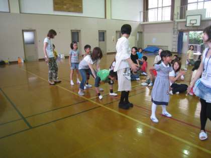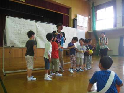 チームに分かれてボール回しをしました。「がんばれー」という声が体育館に響き渡りました。優勝したチームには,手作りのステキなメダルがプレゼントされました。