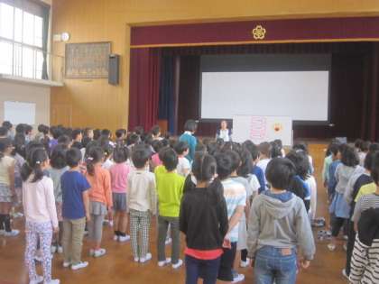 朝会の後,今年度最初のメロディタイムを行いました。最初に校歌をみんなで歌いました。次に「はじめの一歩」という曲を聞き,歌ってみました。希望にあふれたさわやかな曲です。各クラスで練習をして,7月のメロディタイムでは,さらに大きな歌声が響くことを期待しています。