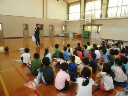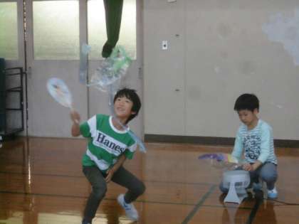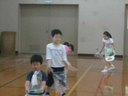 図工で「ふんわりふわふわ」に取り組みました。ビニル袋に思い思いに絵を描いたり,飾りをつけたりして,風に浮かべます。ふんわり浮くように,袋を結んだり,うちわで力いっぱいあおいだりして,楽しく遊びました。