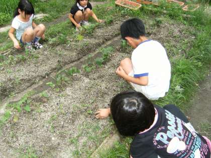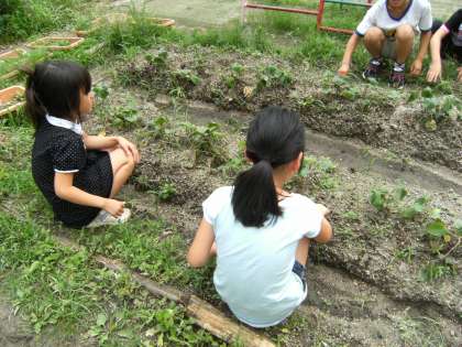 地域の方からサツマイモの苗をいただき植えてから,すくすくと育ってきています。ここ最近の雨と暖かな気候で,サツマイモと共に雑草も育っています。児童の方から自発的に,雑草を抜く姿が見られるようになりました。サツマイモの苗が密集しているので,より大きく育つようにアドバイスをいただきました。今後植えかえて,育ちやすくしていきたいと思います。