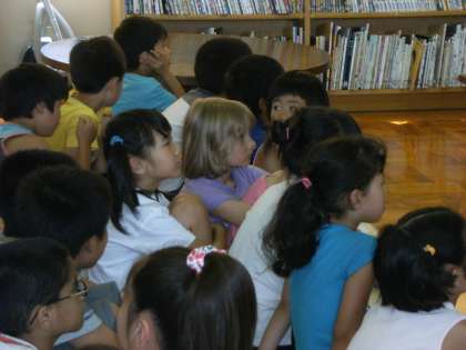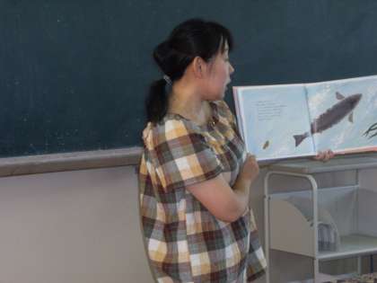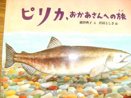ピリカというのは鮭の名前です。鮭が海から川に戻ってきて,卵を産むまでの一生が迫力のある絵を織り交ぜて繰り広げられました。読み聞かせをしていただいて,子どもたちは命のつながりを感じ,鮭の一生の悲しさと尊さに聞きいっていました。