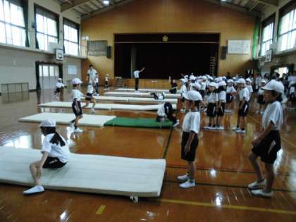 2時間目は、1組2組いっしょに体育館で体育をしました。マットあそびで、準備から活動、後片づけまでみんなでがんばりました。