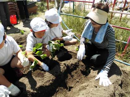 今日は、地域の方にお世話になり、さつまいもの苗を植えました。