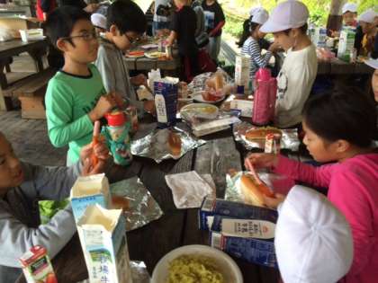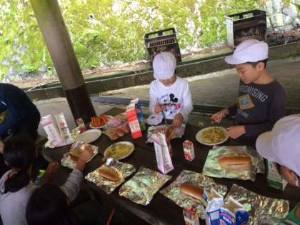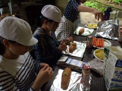 パンにキャベツいためとウィンナーをはさみます。ホイルで包んで、牛乳パックに入れて、焼くのです。