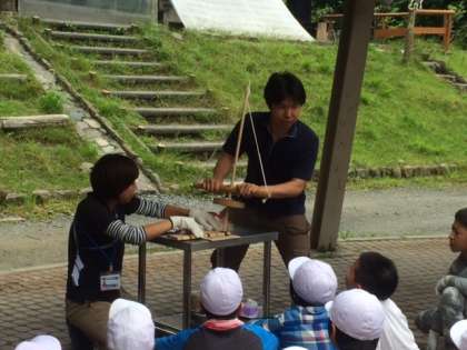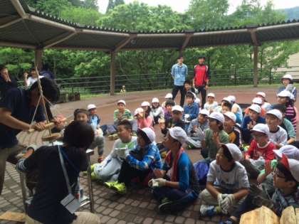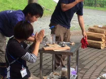 雨も上がり、時おり日がさすようになりました。今から、野外炊事に使う火をおこします。