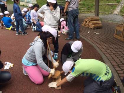 煙りが、かすかに出てきたら、歓声が上がります。静かに息を吹きかけて、ぼっと火がつきます。どのグループも火がつきました!