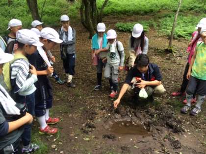 途中、ぬた場という、動物が体を洗う水たまりがあったり、熊の爪あとと思われる木があったりしました。途中、他の学校と出会いました。ややこしくなるので、赤帽にかえました。