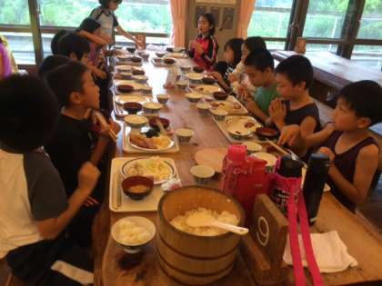 山登りを終え、お腹がぺこぺこの子どもたち。たくさん食べて、次はキャンドルファイヤーです。