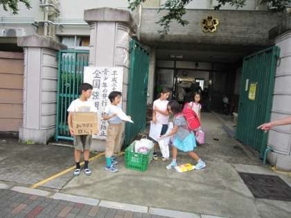 4年生が,エコ,環境学習をしているので,積極的に,取り組んでいます。牛乳パック回収の取組にプラスして,割り箸回収を行っています。夏祭りにたくさんの割り箸がゴミとして焼却されるより,回収して製紙工場で紙にしてもらったほうが,森林保護に多少でもつながるのではと考えての取組です。夏祭りだけでなく,給食のときの割り箸も回収しようというのと夏祭りでの前宣伝もかねて取り組んでいます。