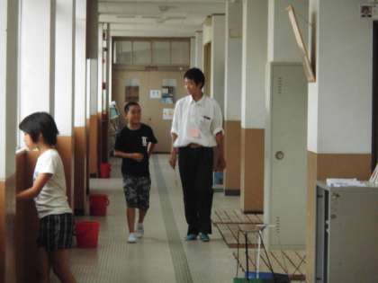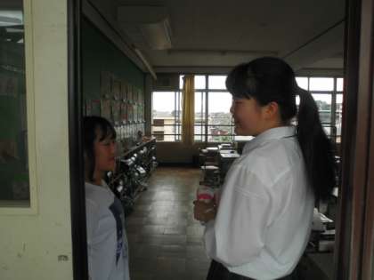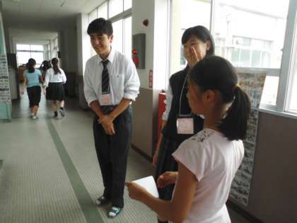 外国語活動の学習で学んだ英語での道案内をいかして、日吉ヶ丘高校の皆さんを英語で校舎案内をしました。この6年間を振り返っての小学校の思い出のエピソード、そして高校生が小学生だった時のエピソードを伝え合いながら楽しく校舎案内ができました。