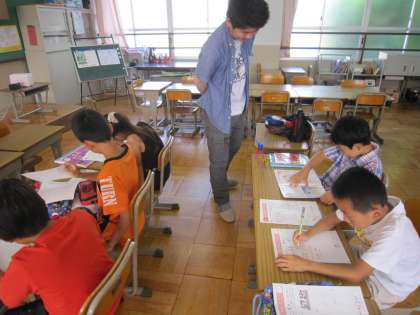 土曜学習がありました。夏の暑い日でしたが元気に登校し、学生スタッフの支援を受けて,しっかり学習に取り組みました。