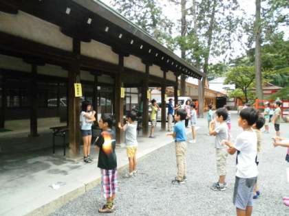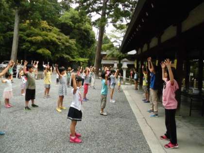 学校は、ラジオ体操第一で雨がきつく降ったようですが、吉田神社では、雨がぱらぱらだったので、ラジオ体操第二も最後まで行うことができました。