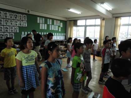 4年生は、他の学年より早く今週の月曜日と火曜日に登校日を設け、「みさきの家」の準備をしました。引率の先生との顔合わせや、キャンプファイヤーの歌や校歌の練習をしました。夏休みの最後の2日間ですが、頑張ってたくさんの子どもが登校していました。