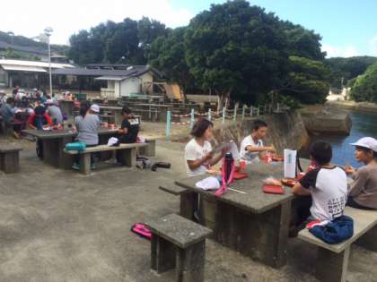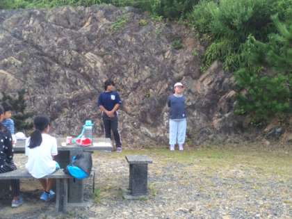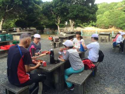 昨日の野外炊事場で朝食をたべました。今朝は、屋根のないテーブルで食べました。時折、気持ちのよい風が吹いています。自然に囲まれての食事です。
