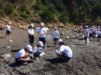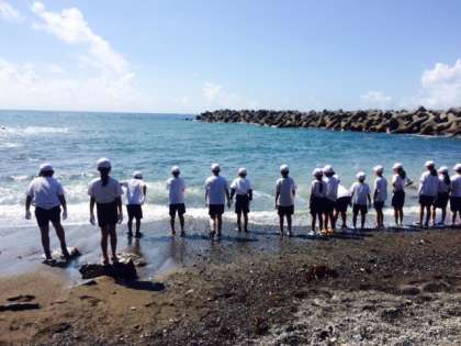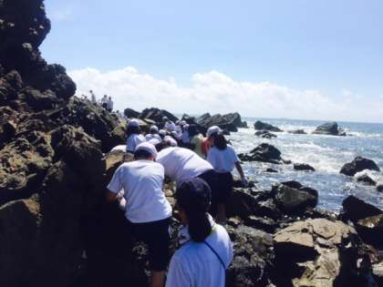 記念の石を拾い、波とたわむれました。時折、大きな波が来るので大急ぎで逃げたり、歓声をあげたり。そのあと、少しだけ岩場に行って、ヤドカリや魚を見つけました。