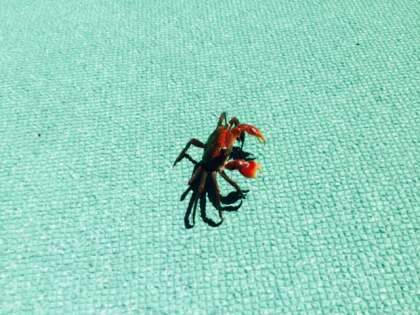 プールサイドにカニを発見しました。みさきならではの光景ですね。