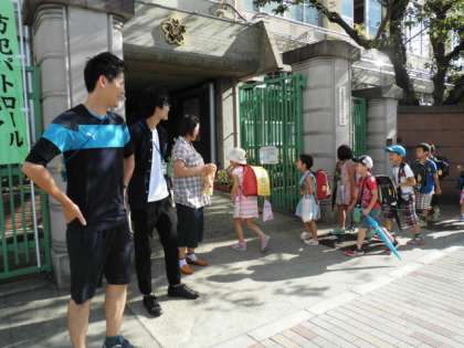 今日も、担任の先生が校門に立って、子どもたちを出迎えていました。