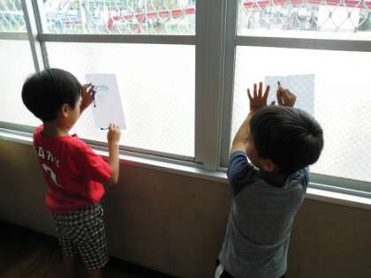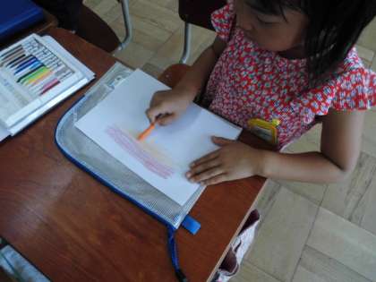 図工の時間に,教室のでこぼこしたところを探して,クーピーで紙にシャカシャカ。