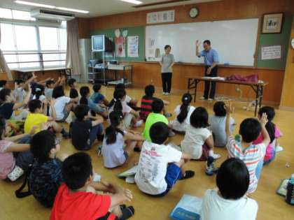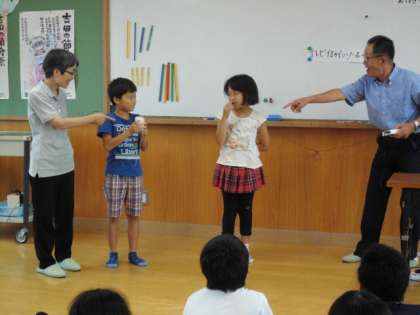 簡単な手話を教えていただいたり,耳の不自由な方が暮らしやすくなるような便利な道具の紹介をしていただきました。赤ちゃんが泣いたことを振動で知らせてくれる道具に,特に驚いている子どもたちでした。