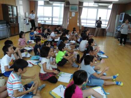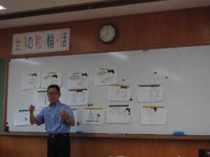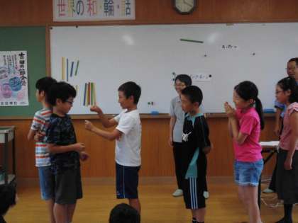 後半には伝言ゲームを行いました。伝言ゲームといっても声を出してはいけません。手話で表したり口の動きで伝えたり・・・。目で相手の思いを読み取ることを楽しく体験することができました。最後は習った手話で簡単な会話をし,子どもたちにとっておなじみの「世界中の子どもたちが」と「believe」を手話でプレゼントして終わりました。とても明るい講師の方のお話に,子どもたちは終始興味津々でした。