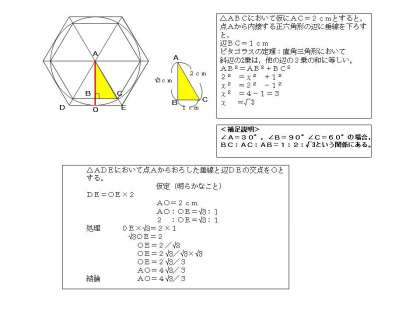 「ある円に外接する正六角形の1辺の長さを求めるには,無理数を使わなくてはなら ないですよね。この場合は,ルート3が必要だと考えますが,…」