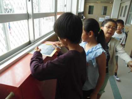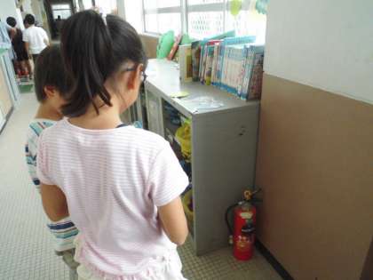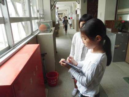 今日は,学校の中にある火事への備えを探しました。グループで学校の中を回り,廊下や教室でたくさんの備えを見つけました。