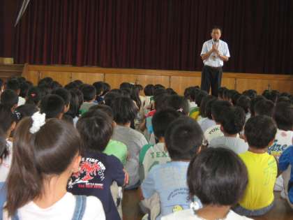 子どもたちは,汗を光らせながら元気いっぱい登校しました。朝会で校長先生からがんばってほしいこと二つのお話がありました。