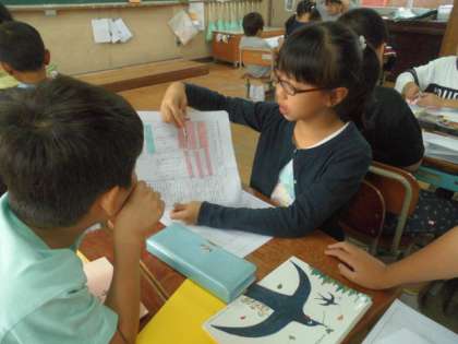 付箋に会話や行動をぬき出して書いたり,矢印を使って初めの気持ちと後の気持ちの変化をわかりやすくまとめたり・・・。それぞれのワークシートに工夫がたくさん見られました。また,まとめた図を使って,自分の考えたことや読み取ったことをグループで発表しました。