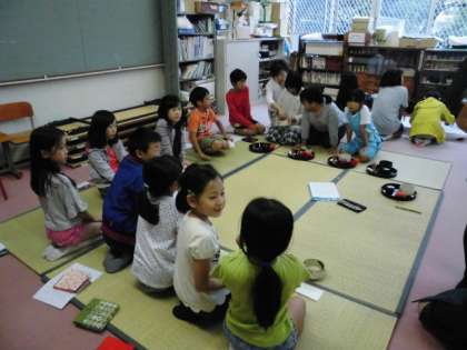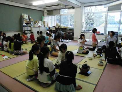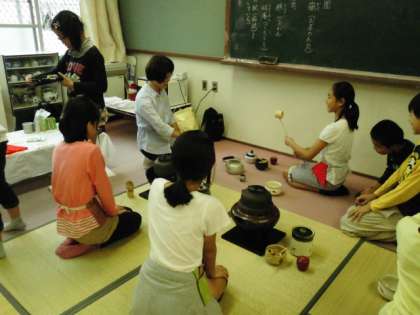 お菓子やお茶をいただいたり、お茶を点てたりする子たち。お点前の練習をする子たち。グループに分かれて練習しています。