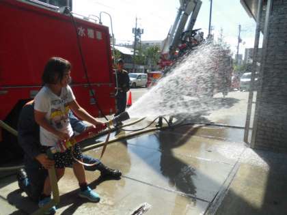 左京消防署へ見学に行き,消防署の方からお話を聞いたり,実際に体験したりしました。