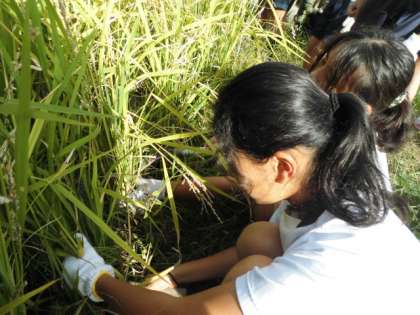 今日は自分たちが育ててきた稲を刈りました。昨日たくさん教えていただいたことが生かされ,とてもスムーズに作業していました。干して,脱穀して,精米してどれくらいの量になるのか楽しみです。2日間お疲れ様でした。