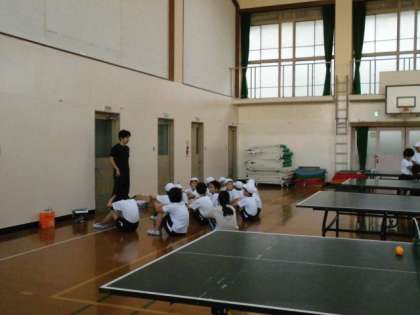 卓球クラブは、ネットをはって準備をし、集合しているところです。これから組み分けをして、打ちます。
