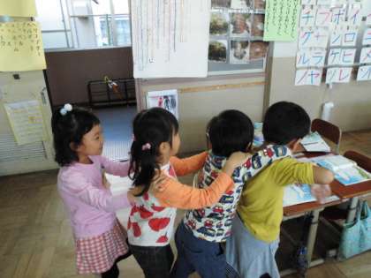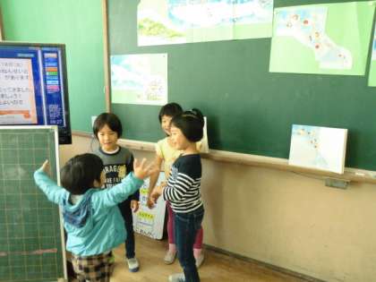 先生,子どもたち,くじらの役に分かれて,楽しく音読の練習していました。