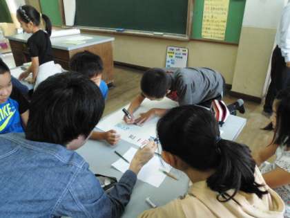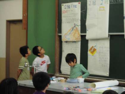 昨日(10月19日)に理科「流れる水のはたらき」の学習があり,そこに京都大学から8人の学生が助っ人で来てくださり,子どもたちと一緒に実験装置を考えていただきました。「どんな実験装置をつくったら流れる水のはたらきがわかるだろう」と班で話し合いながら模造紙にまとめていました。この実験装置は,なんと京大の学生さんが作ってきてくださるという事で,次の時間にその実験装置を使って実験したいと思います。どんな実験結果になるかな…?