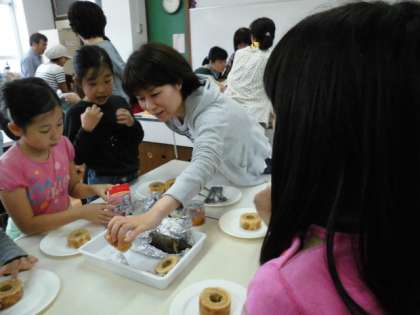 それが終わると、家庭科室に戻って、棒をぬき、アルミホイルも取っていよいよ切り分けます。