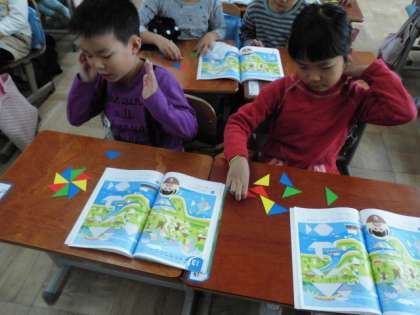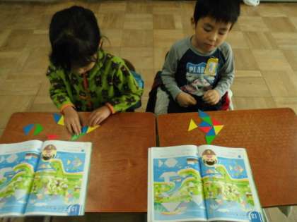 算数の学習で,色板を使って形を作りました。